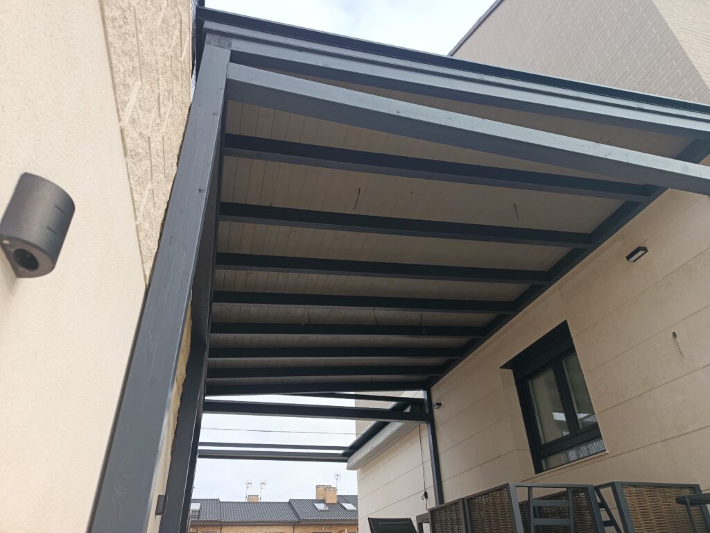 - Cubierta Personalizada: Según tus preferencias, instalamos acabados en teja cerámica, panel sándwich imitación teja o policarbonato, asegurando una impermeabilización total. En esta ocasión, el cliente se decantó por una cubierta aislada térmicamente y rematada con tegola americana.